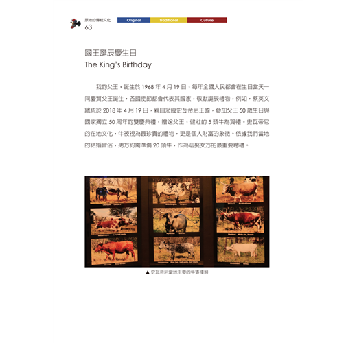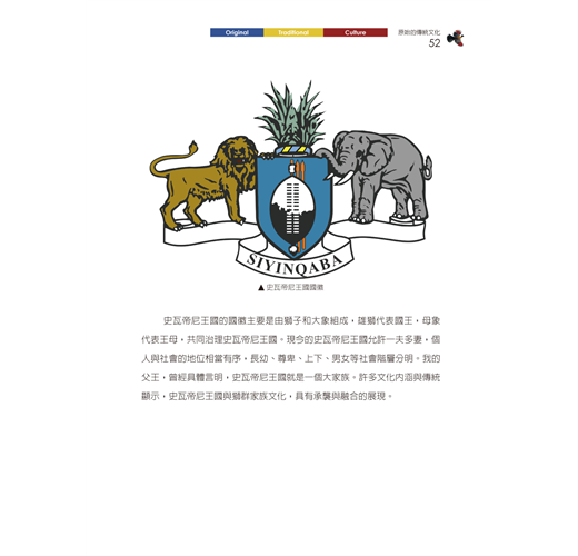 史瓦帝尼王國的國徽主要是由獅子和大象組成,雄獅代表國王,母象代表王母,共同治理史瓦帝尼王國。現今的史瓦帝尼王國允許一夫多妻,個人與社會的地位相當有序,長幼、尊卑、上下、男女等社會階層分明。我的父王,曾經具體言明,史瓦帝尼王國就是一個大家族。許多文化內涵與傳統顯示,史瓦帝尼王國與獅群家族文化,具有承襲與融合的展現。