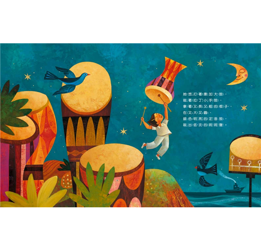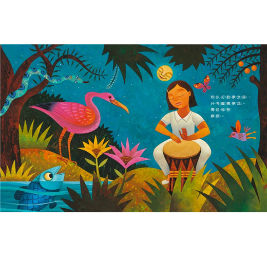 女孩以不懈的努力及執著,突破傳統對女性的限制,實現了當鼓手的夢想,溫暖且激勵人心。飽滿夢幻的畫面搭配輕快節奏的語句,讓閱讀彷彿有熱情洋溢的鼓聲伴隨著,咚、咚、咚的朝著希望與理想邁進。