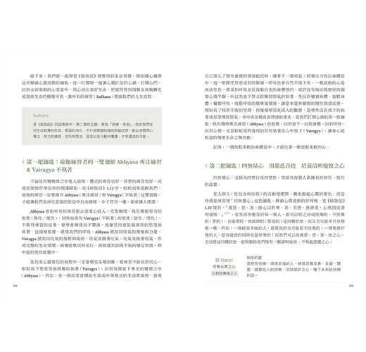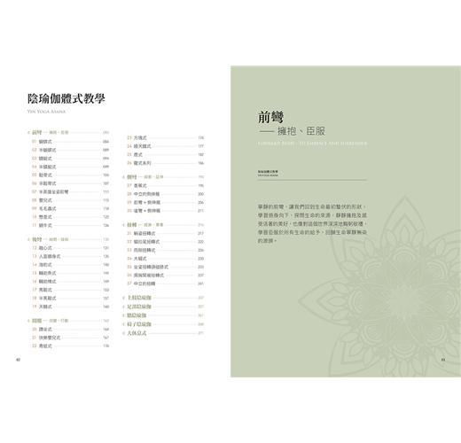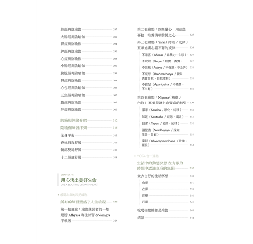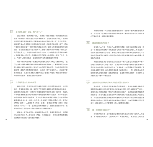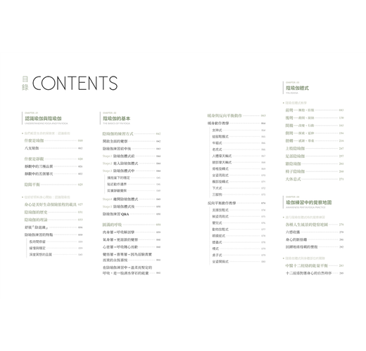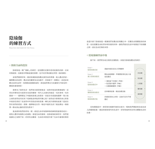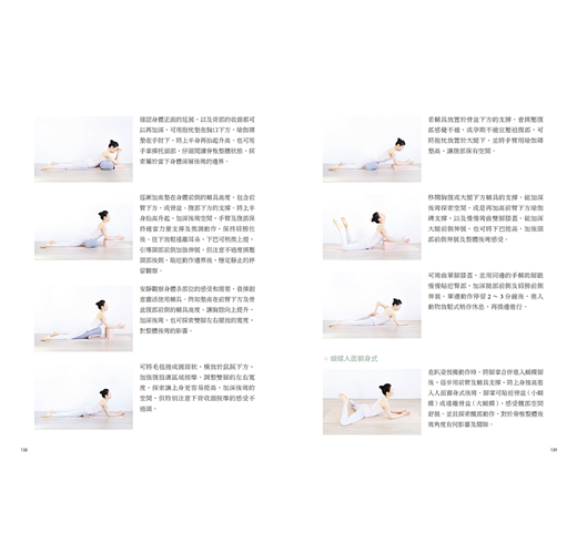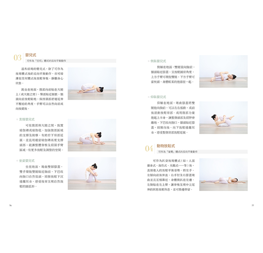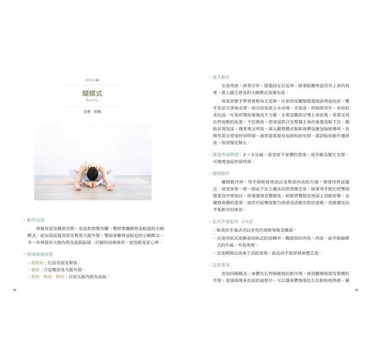 從暖身動作、反向平衡動作到陰瑜伽體式,都有提供完整詳細的圖文步驟示範,並說明進入動作、結束動作時的注意事項等,讓新手也能跟著Step by Step跟著操作不NG,並學習在舒展肢體時,調節自我的內在狀態。