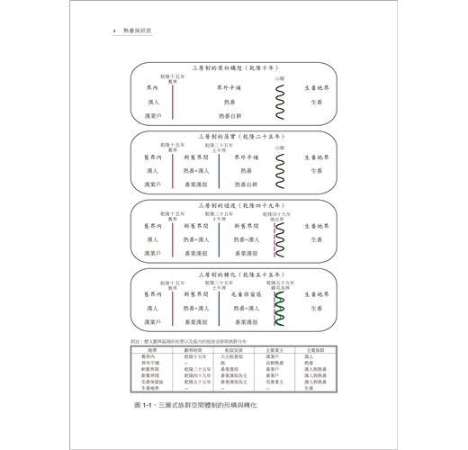 在這個轉變過程中,牽涉四種角色,外來統治者清帝國政府、遷移來臺尋求新天地的漢人、蟄居內山但會出草的高山原住民(生番),以及原本就住在平地而已歸順的平埔族群(熟番)。柯教授從《番頭家》就提出「三層制」的理論,「生番在內,漢民在外,熟番間隔於其中」。本書針對中間夾層熟番與漢民糾葛的複雜問題進一步析論,更著重於國家權力操作族群分化。所以傳統膚淺又帶偏見的「漢人中心移墾開化論」,他置之不論,而對「國家剝削說」與「國家理性保護說」有所商榷。在國家理性制度的規範下,柯教授還看到政治實作過程中的權宜和權術,也注意到社會底層的變化和能耐。他發現國家「善意」地扶植熟番菁英,反而造成原來族群內部的裂解;想要防範漢民豪強,卻又空出自由與可能的界域。所以國家權力的理性運作,不一定會有如意算盤的收成。我想在這個領域的論述,本書承襲過去同行積累的成果,進而更上一層樓。