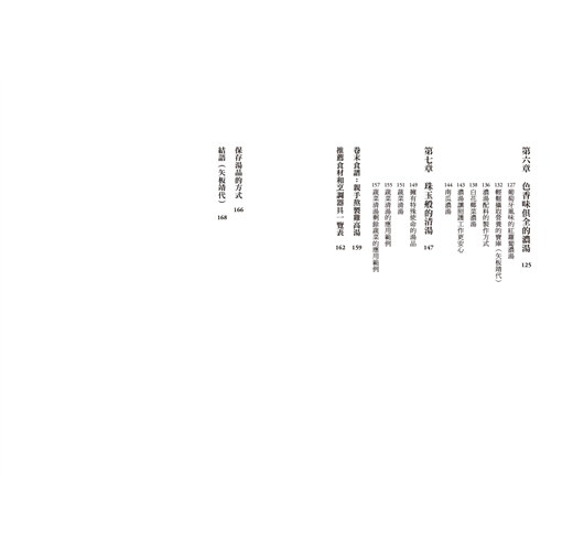 ──「澄清的雞湯、滑順的濃湯、清爽的濃湯、料多豐富的湯、雞湯、羅宋湯、馬賽魚湯。只要願意下功夫就能做出美味的湯。而且這個功夫下的讓人心服口服。」