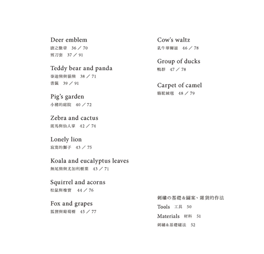 本書收錄基礎繡法、縫法,以及基本材料、工具的介紹及使用方法,即使是初學新手,也可輕鬆上手實作,選擇喜愛的動物,打造自我風格的刺繡手作,一同進入樋口愉美子老師以動物主題創作的可愛世界吧!