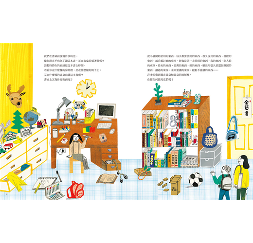 這是一本有點漫畫味道的繪本工具書,是書本、書桌與文具的神奇探索之旅。