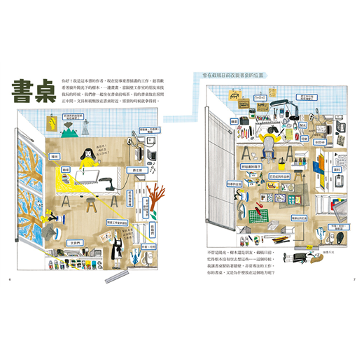 本書特別之處不只如此,作者以圖為主、文字為輔,畫出自身的經驗,建議大小讀者可以如何整理書桌與使用文具,精細的圖繪表現以及幽默風趣的筆調,帶出與我們一般常見且生硬的工具書,以及學術性百科的不同風貌,雖然淺顯易懂,卻十分具有參考與實踐價值。在生活緊湊卻又要面對書桌整理、文具歸類,甚至橡皮擦屑掉滿地這種苦惱事,不論是家長看孩子的「調皮搞怪」,在這本書裡都有參照的行為可供說明解釋,還附上禁止行為樣態提醒小孩;小孩想要自己學習整理,大人跟進參照,在這本圖畫書,也都有詳盡的使用步驟與用途說明;對和我一樣在學校服務的教學者而言,適當的使用書桌,如何閱讀,如何使用筆記等,不僅可以當作教學參考資源,也是一本提供學生自學的好範本呢!