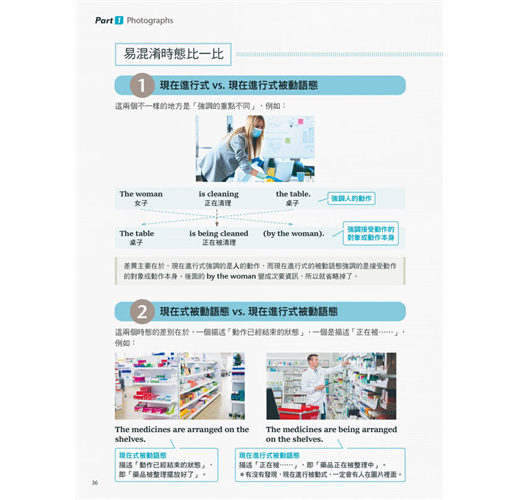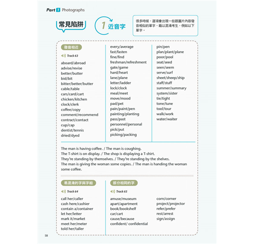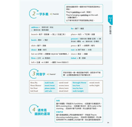 例如Part 2「應答問題」針對Wh-疑問句、Yes/No是非問句、選擇疑問句及直述句等必考題型提供辨識方法及常見應答模式;Part 3「簡短對話」整理出常見題型、聆聽重點與常見對話劇本。各大題練習皆藉由關鍵字詞聽寫及漸進式的考題練習,一步步帶領考生熟悉、攻克各類題型,掌握考試重點。