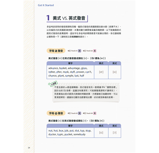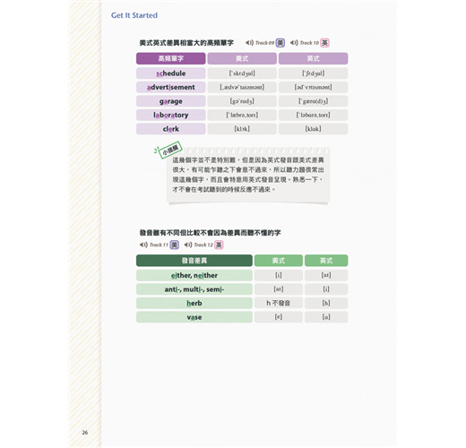 比較英美發音的主要差異,並針對考生常面臨的聽力障礙(如連音、省略音等)提供基本語音規則與說明。