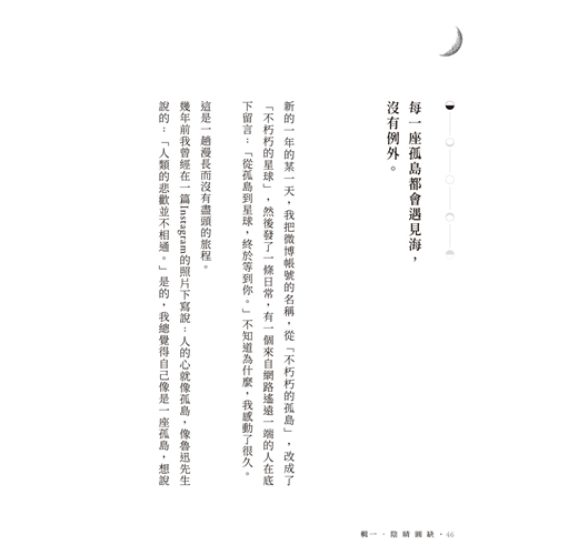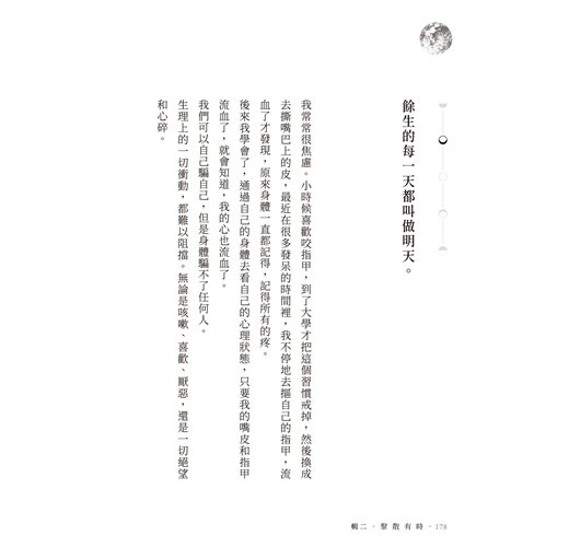 在最想要離開我自己的時候,天上總是有月亮。它總是好亮好亮,亮晶晶的弦月陪我走過了想死和想生的荒日。