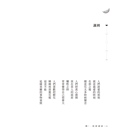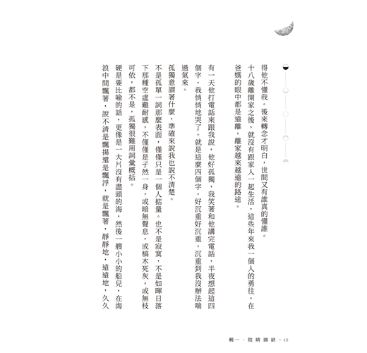 而在很多個以後的日子,我仍然逐漸被夜晚淹沒,仍然無法逃辭失眠的牆垣,可是藉此,我學會了去愛那些不夠圓滿的事物。