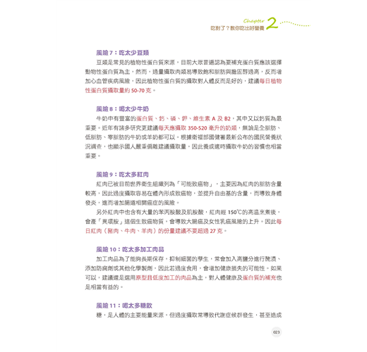 另外紅肉中也含有大量的苯丙胺酸及肌胺酸,紅肉經150℃的高溫烹煮後,會產「異環胺」這個生致癌物質,會導致大腸癌及女性乳癌風險的上升。因此每日紅肉(豬肉、牛肉、羊肉)的份量建議不要超過27克。