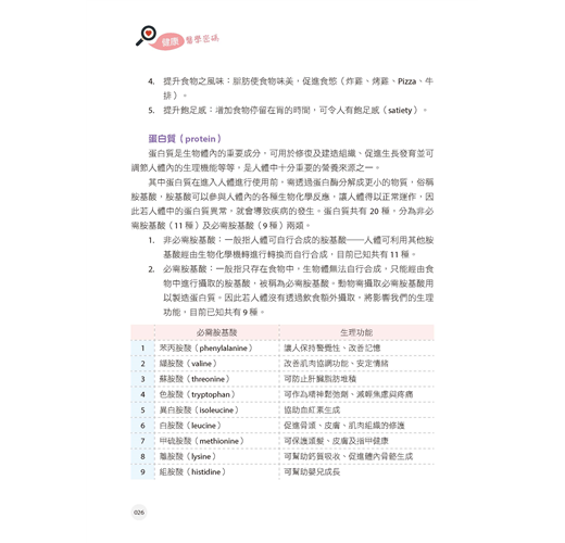 其中蛋白質在進入人體進行使用前,需透過蛋白.分解成更小的物質,俗稱胺基酸,胺基酸可以參與人體內的各種生物化學反應,讓人體得以正常運作,因此若人體中的蛋白質異常,就會導致疾病的發生。蛋白質共有20種,分為非必需胺基酸(11種)及必需胺基酸(9種)兩類。
