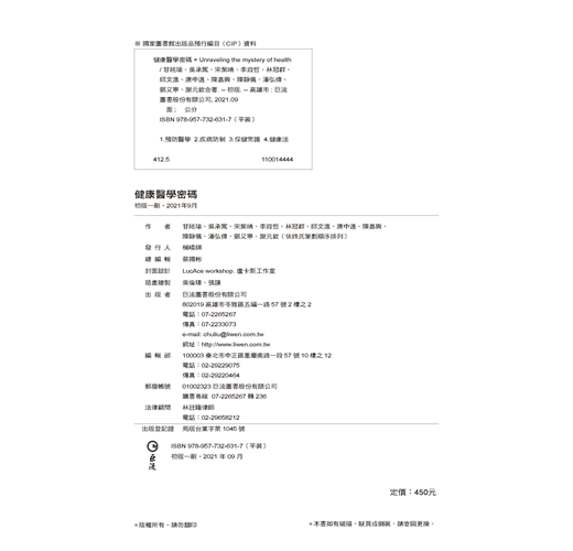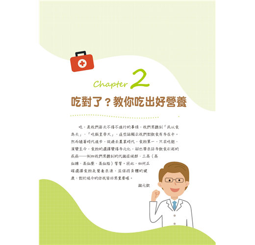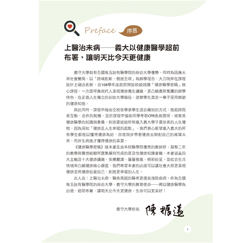 義守大學醫學院教師跨域整合健康醫學和智慧科技兩大領域,並以健康問題結合生活情境,從預防疾病的觀念開始,涵蓋生理與心理各個面向,打造深入淺出的醫學知識讀本,推薦給所有正值人生獨立的初始階段的你。