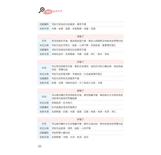 [作用] 可以堅固骨骼和牙齒、幫助血液凝固,協助肌肉和心臟收縮、協助神經系統、傳導功能
