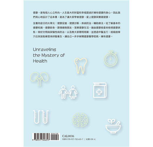 全書內容分四大單元:健康促進、健康診斷、疾病防治、輔助療法。從了解基本的健康知識、健康飲食、跟情緒做朋友,落實健康生活,藉由健康檢查來檢視健康狀態,做好文明病與慢性病防治,以及教大家聰明用藥,並透過中醫五行、經絡按摩穴位與放鬆練習來紓壓養生,讓自己一步步解開健康醫學密碼,擁有健康。