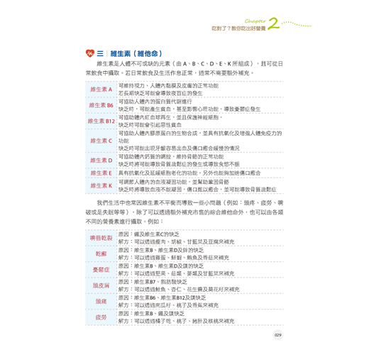 我們生活中也常因維生素不平衡而導致一些小問題(例如:頭疼、疲勞、嘴破或是失眠等等),除了可以透過額外補充市售的綜合維他命外,也可以由各類不同的營養素進行攝取。例如: