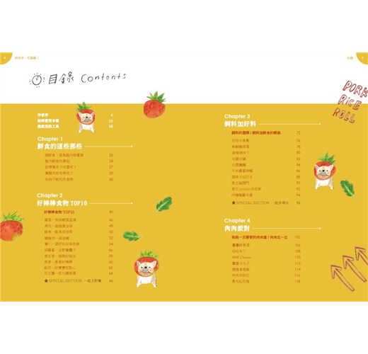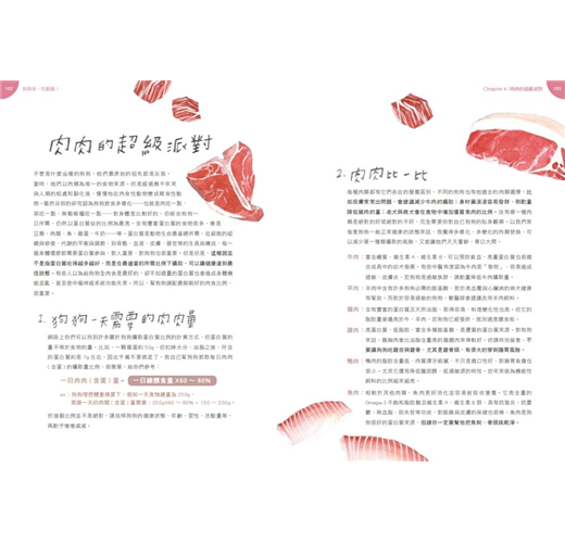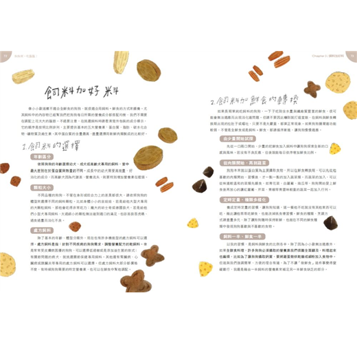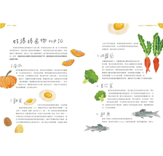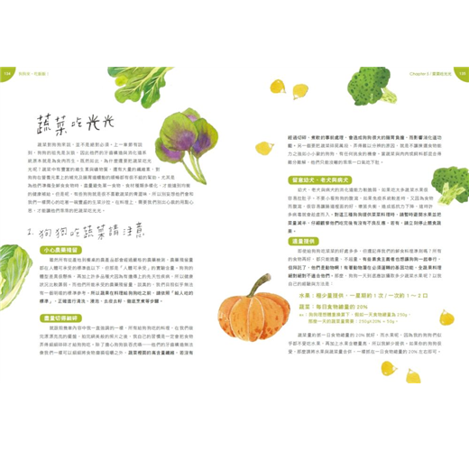 書中會介紹許多對狗狗身體有益或富含營養素的食材,但無論哪種食材有多厲害或是感覺上與狗狗狀況有多搭,都建議「少量多樣」,以多樣化但少份量的各種食材來做鮮食料理的搭配是很重要的觀念,要記得喔。