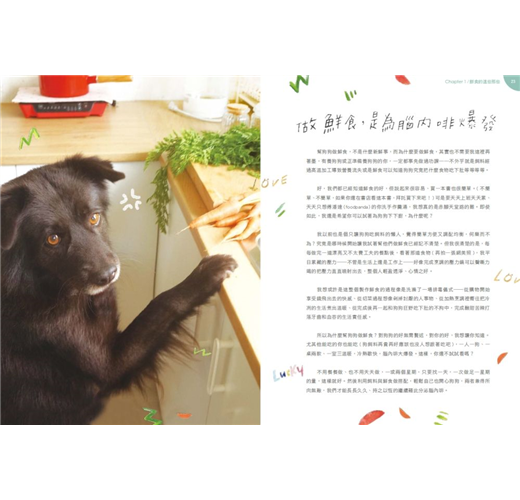 有狗狗陪伴的日子歡樂又溫馨。為狗狗做鮮食,可以很簡單。現代人生活忙碌,常常三餐都無法好好地吃。但是為了狗狗與自己的健康,不妨下下廚,不僅療癒了心靈,也填飽狗狗與自己的胃。只要花一次烹調時間,就能把自己和狗狗的食物一起煮好,沒有調味的給狗狗,加一點調味的就是給自己的。