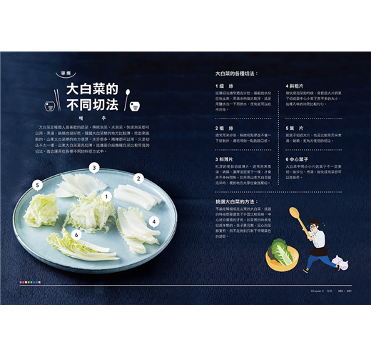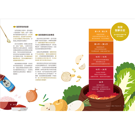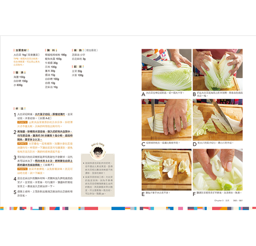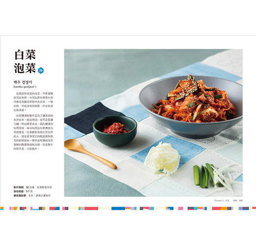 全書從食材的挑選、介紹、切法,到各種烹調重點、步驟提醒完整收錄。同時仔細標示出每道菜放幾天吃最好吃、需不需要發酵、吃不完時的延伸吃法,還有想做素食版本怎麼調整等,一本萬用!