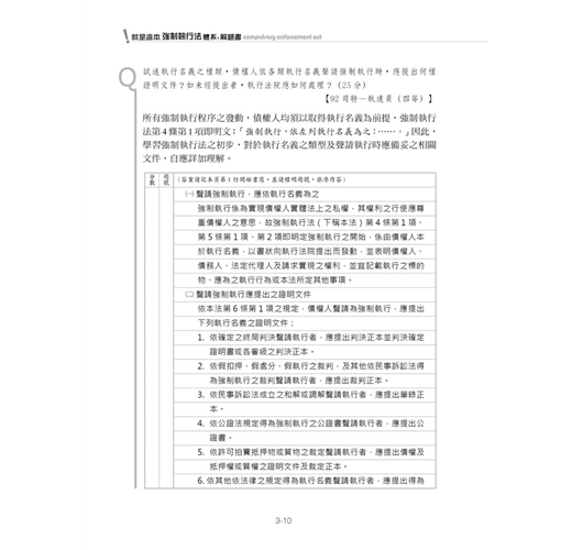 「強制執行法」是非常實務運作的法律,若僅研讀法律規範卻缺乏實務經驗,往往空留見樹不見林之憾。筆者匯集多年強制執行實務經驗,並融合多年補教界教學經驗,以實務經驗為經,以國考應答為緯,經緯縱橫,撰寫此書,相信必能協助讀者一窺強制執行法之堂奧,在國家考試的戰場奪取高分。