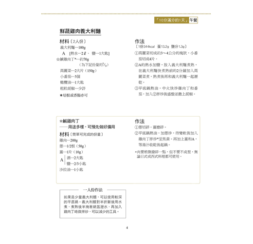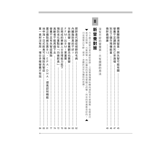 預防疾病就是要預防生活習慣病以及癌症、腦中風、心臟病和腎臟病。預防老化則是要預防失智和運動障礙症候群,預防疾病重點在「避免肥胖」,預防老化重點在「避免過瘦」二者看似矛盾,但共通點是「均衡的飲食」。本書強調「十種食物多多益善」,也提供了簡易的食譜。