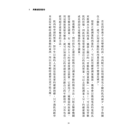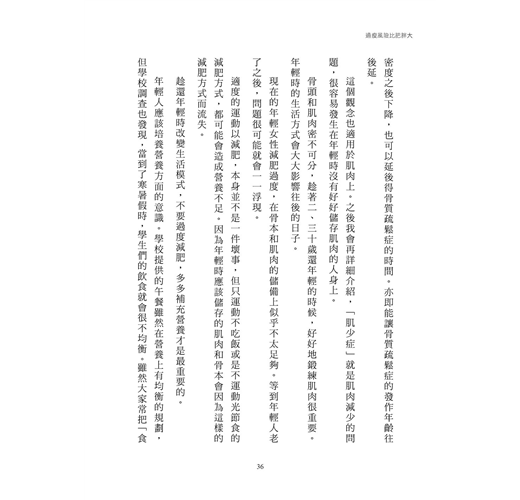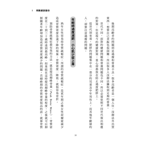 新開省二醫師提到預防骨質疏鬆最有效的方法是提高巔峰骨量,骨質密度在20到30歲達到最高峰。如果能在這時提高巔峰骨量,之後就可以抑制隨著年齡增加造成骨質密度減少的問題。而肌少症的預防也是一樣,年輕人運動並補充蛋白質,肌肉的纖維會增加,每條纖維也會變胖。年紀大才開始運動及補充蛋白質,效果沒有年輕人好,所以作者主張40歲就該抗衰老!