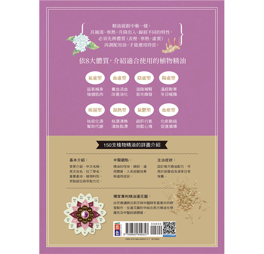 ‧以氣虛、血虛、陰虛、陽虛、痰濕、濕熱、氣鬱、血瘀等八種偏差體質為章節分類,依序介紹適合用來改善該體質的精油,共150支精油。