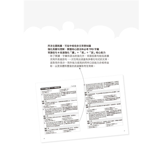 ●以形容詞為例,就包含了多樣化的搭配,迅速吸收各類循環必考字,一舉獲取高分。(a perilous journey/an irrecoverable situation/ this pristine forest/ his preeminent capacity/almost perpendicular to the surface/ pervasive developmental disorder等等常考搭配。)