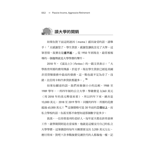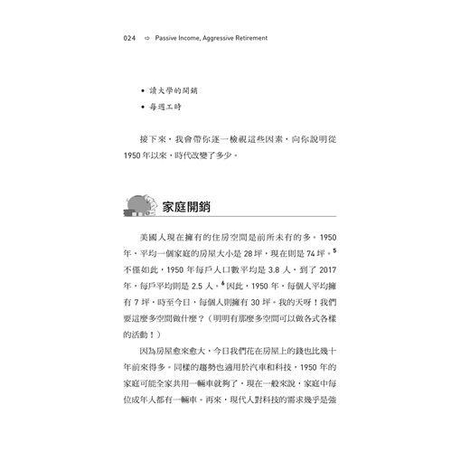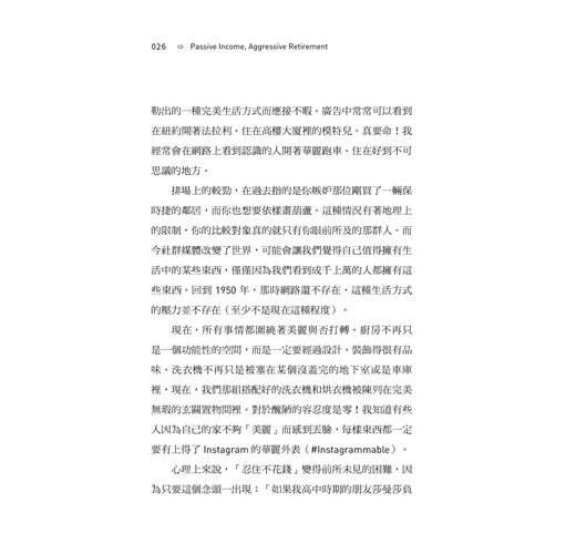 有太多、太多方法可以達成 FIRE 了─你可以節儉度日、可以在高投資收入國家賺錢,再到生活成本低的國家退休長住、可以存到相當於你年支出 25 倍之多的錢、可以投資不動產、可以做副業,凡此種種。即便如此,有鑒於現今世界在財務方面充滿挑戰,還是有大量的人覺得 FIRE 很不切實際。大家都認為 FIRE 只適用於那些收入六位數的頂客族(雙薪無子女的家庭),並且處在生活支出極低的區域,因此才有辦法縮衣節食、精打細算過日子,然後在 40 歲時退休。但是,我現在就是要告訴你,任何人,無論住在哪、無論薪水多寡,都可以達成 FIRE。在本書中,我特別強調了一種達成 FIRE 的策略,這個策略對所有人來說都是最適切、最可行的,而且將會重燃你的希望。