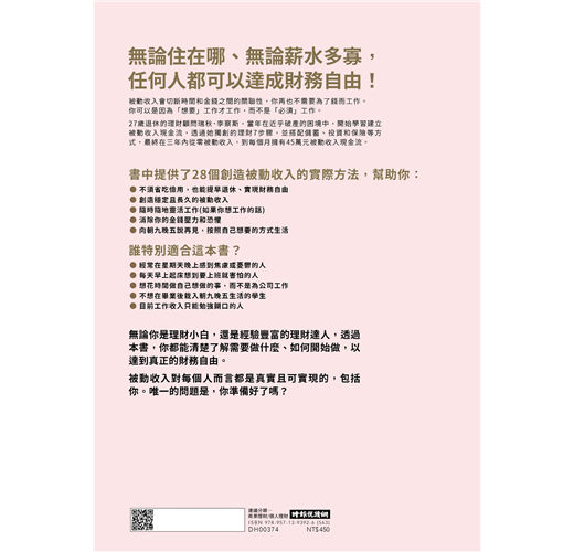 無論你是理財小白,還是經驗豐富的理財達人,透過本書,你都能清楚了解需要做什麼、如何開始做,以達到真正的財務自由。被動收入對每個人而言都是真實且可實現的,包括你。唯一的問題是,你準備好了嗎?