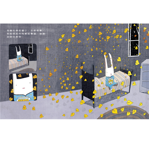 「索索悄悄的走出門,走進沒有月光的夜晚,把流星雨蒐集到罐子裡。當這個箱子送到蘇蘇手中,她打開罐子,夜空中的星星就在她身旁墜落。」