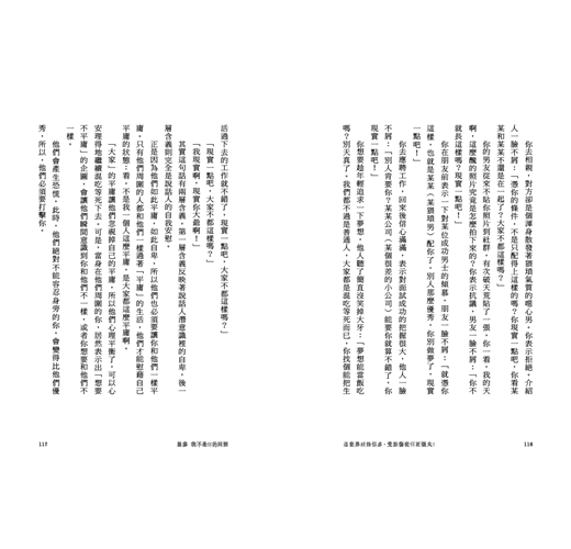 (口頭禪:大家都是這樣)喜歡把他們的失敗感、平庸感無條件放在別人的肩頭,一起來替他們分擔。不停勸你將就、湊合,是因為他們自身的現實早成了牢牢壓住他們的石頭。