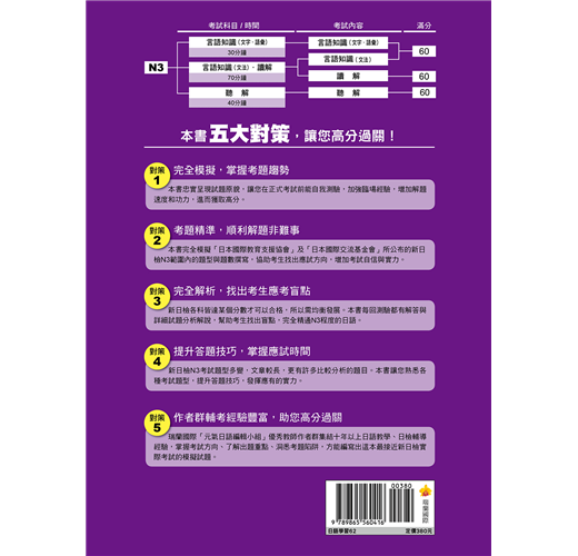 新日檢N3考試題型多變,文章較長,更有許多比較分析的題目,準備不夠充分的話,在考試時往往無法順利寫完所有試題。本書讓您熟悉各種考試題型,提升答題技巧,發揮應有的實力。