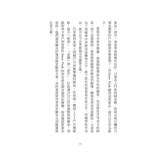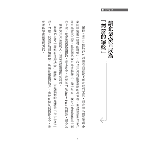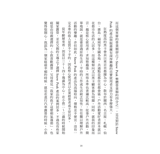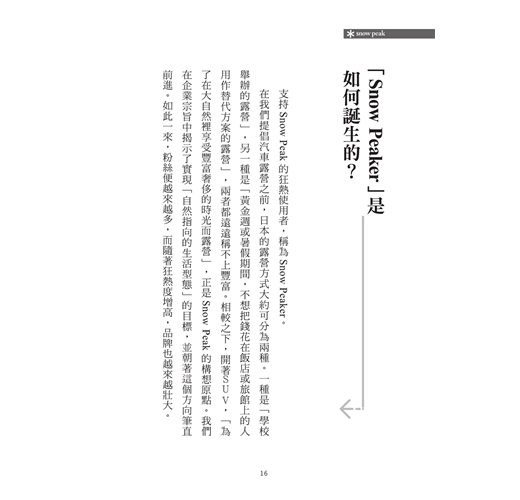 ★露營、登山愛好者必用品牌Snow Peak社長第一本著作,娓娓道來Snow Peak如何從新潟三條市的五金批發商行轉型成露營登山品牌,歷經大起大落之後,穩定成長、甚至成為上市公司,並且在台灣、韓國、美國展店,持續進軍世界!