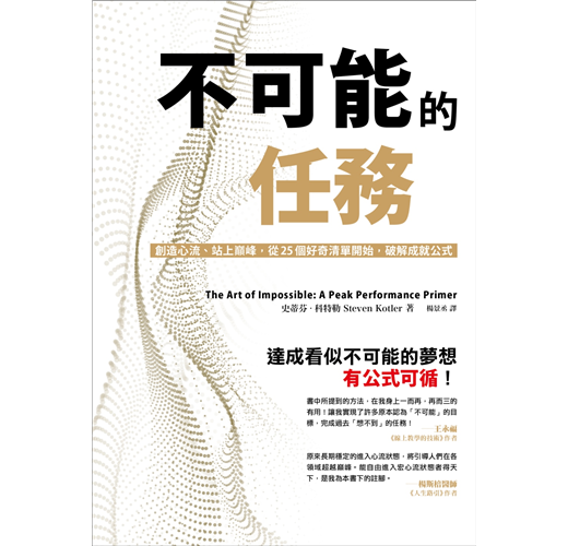 史蒂芬.柯特勒在書中精彩地說明了許多對顛峰表現者而言很直觀卻無法解釋的事實:達成不可能是有公式可循的。柯特勒解開這個謎團、破解公式,並告訴讀者可以使用哪些工具去達到夢想,不論是多遠大的夢想。