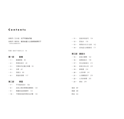原來長期穩定的進入心流狀態將引導人們在各領域超越巔峰。至於如何進入心流狀態,如何維繫心流狀態於不墜,甚至如何從普通的心流變成強大的心流,他也一一細數。