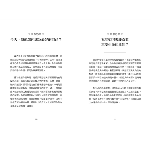 或許你會想要和信任的朋友分享某些意義重大的問題,從對話中碰撞出火花。那麼,請務必提起你最喜歡的那些問題,並練習以積極、正面的思考方式來組織你的答案。養成持續的自省習慣,可以為你的個人成長、幸福感及喜悅帶來極大的好處。更重要的是,你要接納從這些問題所得到的新觀點,即便只有一個問題觸動你的心,那也算是成功了。