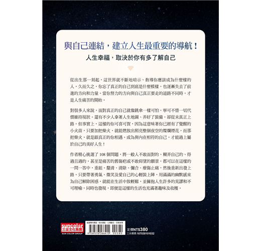 作者精心挑選了108 個問題,將一般人不敢面對的、糊弄自己的、得過且過的,甚至是痛苦的舊傷疤或不敢仰望的願景,都可以在這樣的一問一答中,重組、釐清、清除、彌合、療傷止痛,然後重新出發上路。只要帶著勇氣、微笑及愛自己的心輕裝上陣,用滿滿的幽默感來為自己解除困惑,就能在生活中放輕鬆,並擁抱人生許多的荒謬和不可理喻,同時也發現,即便是這樣的生活也充滿著趣味及收穫。