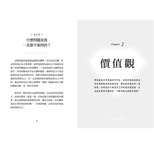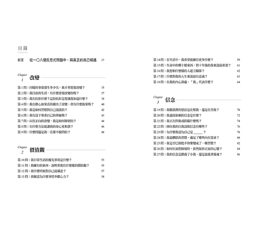 本書提出的108個自我提問的問題,可以歸納為十二個主題—每個章節闡述一個主題,每一個主題有九個問題。在每一個問題之後,都有關於其意義的解說,以及如何更深入思考的指引。你可以按照章節順序閱讀,每個月或每年思考一個主題,也可以翻到你最感興趣的主題來仔細閱讀,深入探索每一個和你目前生活最相關的問題。有些問題看起來似乎很類似,但實際上是針對特定主題另一個層面的探討。