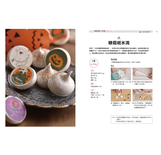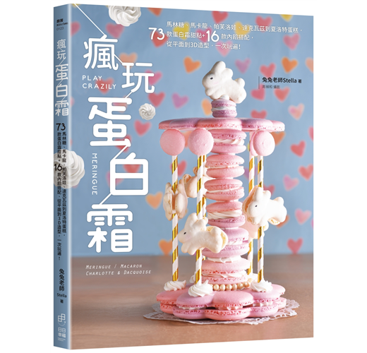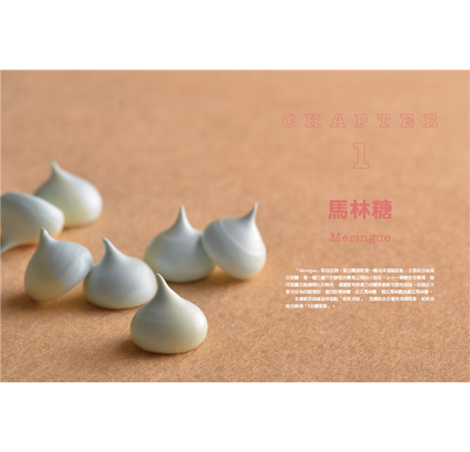 很高興這次能和日日幸福出版社合作,一同完成關於蛋白霜的一切。平常教授造型馬林糖課程為主,接觸各樣式的造型蛋白霜。這本書將擴大延伸和蛋白霜相關的甜點。整個蛋白霜家族擴及了馬林糖、馬卡龍、達克瓦茲、帕芙洛娃以及手指蛋糕。蛋白霜可謂是甜點的架構,要搭配不同的甜點類型選用不同性質的蛋白霜。在籌備期間覺得自己宛如重回校園,做起了研究生的角色。不斷的測試紀錄蛋白霜的可能性,過程相當充實有趣。