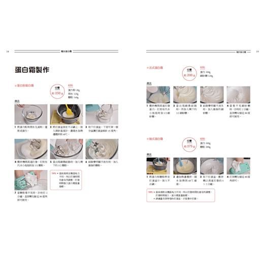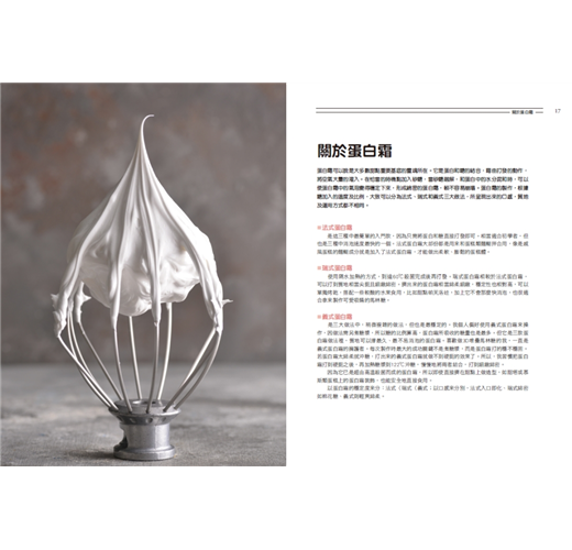 讓你快速上手,完全享受製作甜點的樂趣!蛋白霜可以說是大多甜點的重要基底靈魂所在。它是蛋白和糖的結合。藉由打發的動作,將空氣大量的灌入。在恰當的時機點加入砂糖。當砂糖融解,和蛋白中的水分混和。可以使蛋白霜中的氣泡變得穩定下來。形成綿密的蛋白霜,較不容易崩塌。而蛋白霜的製作,根據糖加入的溫度及比例。大致可以分為法式、瑞式和義式三大做法,所呈現出的口感、質地及運用方式都不相同。