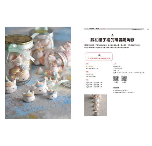 收到書籍內文圖檔,整個驚呆了!!每個成品真的是超級療癒的啦~Stella老師和備課一樣用心的編寫每個成品中各個顏色的用量,讓讀者能夠清楚的知道每個成品需要準備多少蛋白糖霜;在有圖稿的成品,也加上QR碼讓大家掃描,我真心推薦這一本宇宙超級無敵棒的工具書給大家!