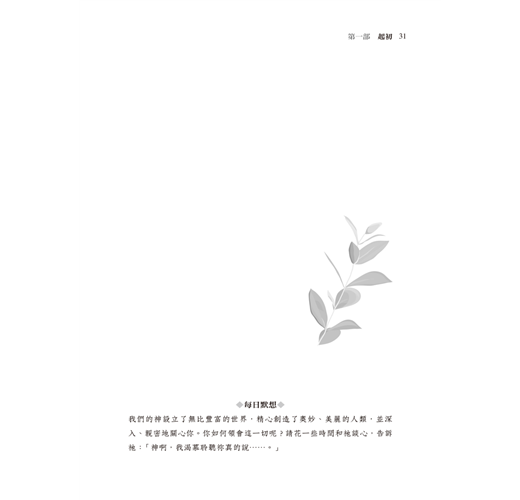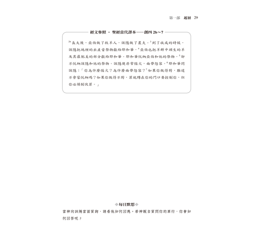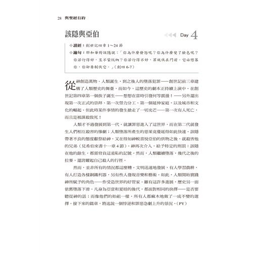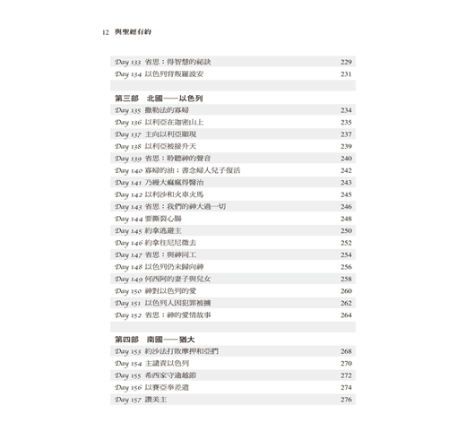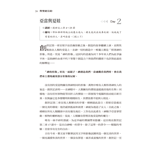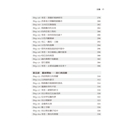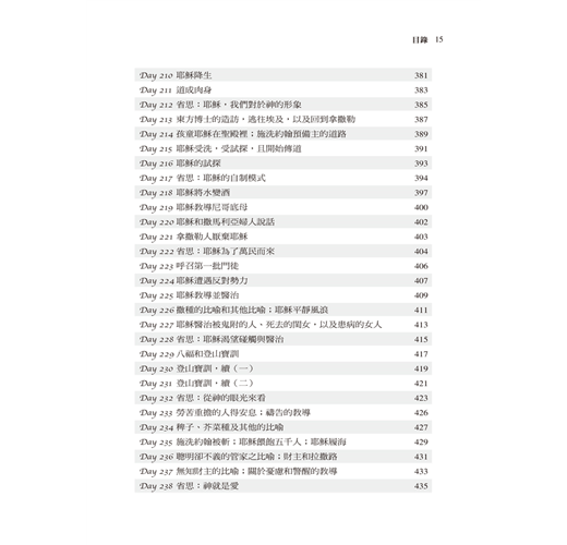讀者該如何善用這些經文段落和其相關評論呢?這些重要的經文段落是從舊約和新約聖經中挑選出來的,談到神與祂子民之間的關係,這故事從創世記開始,延伸至啟示錄中祂所應許的永生。而關於評論,則是解釋相關的經文段落—例如探討聖經許多曲折的敘述、經文中引人入勝和被人所忽略之處、美好和作惡之人、對永恆的信念,以及關於神和祂的獨生子的描述。這些由經文段落和其相關評論組成的每日文章,佔本書大多數的篇幅。