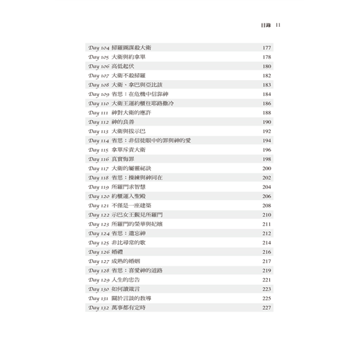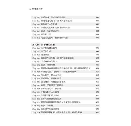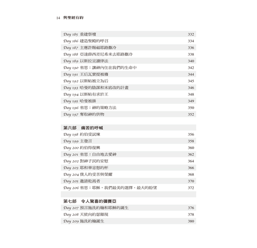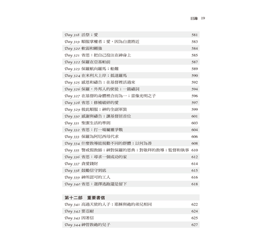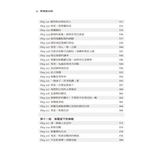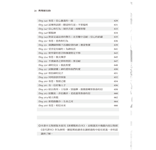 本書共有366 篇文章,可以在一年中,一天一篇讀完。內容分成兩種類型:一段聖經的主要經文章節,以及對該段經文的評論或解說;一段「省思」的靈修小品,佔書中較少篇幅。