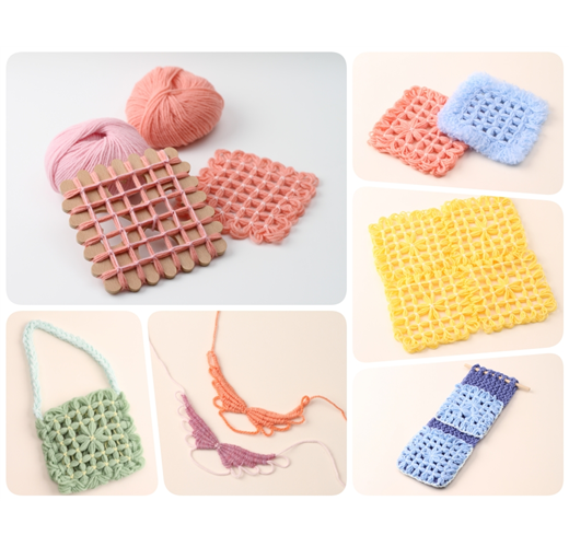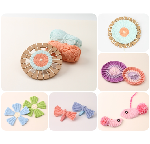 圓形的花花編織器可以編出圓形造型的物品,做出圓墊、花花飾品、小吊飾等。方形的餅乾編織器搭配繞縫,同樣可以創作出方墊、包包與抱枕。產品附上安全彎頭大針眼的手縫針,讓幼兒可以安全接觸基礎縫紉。