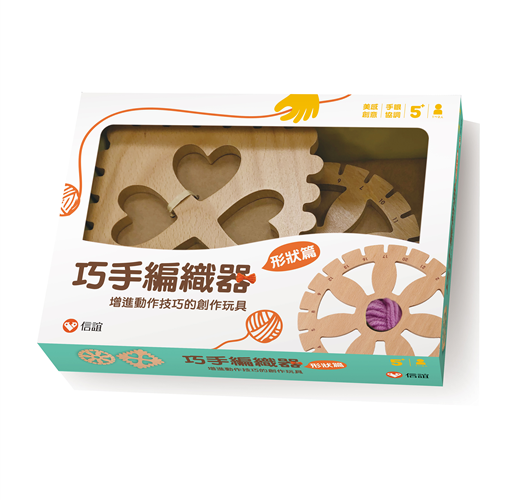 「巧手編織器—形狀篇」延續巧手編織器的設計概念,提供孩子更多樣的編織體驗。可以編縫出圓形與方形的片狀編織物品,動手做出不同花紋的桌墊、包包等。讓編織巧思多更多、變化多更多!