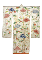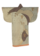 而輕巧的夏季服裝或稱「帷子」,形式類似小袖,但並無襯裡,且採用植物的韌皮纖維製成而非絲製,至於輕薄且無襯的絲製夏季衣裝則稱「單衣」。在外袍沿肩胛顯眼處繡上家紋──誠如最廣為人知的德川家紋──可用來辨識衣服屬於哪一家族的財物,以避免在衣物的開銷上有分毫浪費(圖23、24)。江戶時代,部分武士階級的女性喜歡用魚鷹和漁船圖樣來設計她們的夏季服裝,這類夏季圖樣的元素組合直至二十世紀仍保有其流行地位,只不過不再專屬於精英成員,更新的版本則以低調的抽象波紋當作背景,上頭有化學染料製成、生動的彩繪魚鷹與花卉,是本土琳派和異國新藝術風格(Art Nouveau)重構後的發想(圖25)。