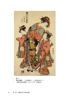 木刻版畫「浮世繪」上頭即刻劃了各個時代的時尚先驅──青樓女子和歌舞伎演員,他們身上清楚記錄了當時的服裝設計趨勢。木刻版畫搭配紋樣書,不僅提供了那個時代主要設計款式的豐富資訊,亦揭示了可能存在於紡織業與出版業間的合作──雙方共同努力,以刺激消費者對時尚服裝的欲望。藝術史學家艾倫‧霍克利(Allen Hockley)以他對礒田湖龍齋《雛形若菜初模樣》(雛形若菜の初模様,約一七七五年)系列的研究為基礎,主張「妓院老闆、雛形本印書商及衣料或和服貿易商之間的關係」確實存在(圖18)。雖然學者目前仍無法證實是哪一方承擔了這些系列版畫的費用,但大多數都認同,出版商選擇繪師及主打的題材時,首要評估的是市場的接受度。換句話說,這些版畫正是商品。