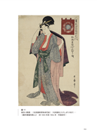 木刻版畫展示了江戶時期各種可供選購的時尚衣物。喜多川歌麿(一七五三~一八○六年)的《夏衣裳當世美人》(約一八○四~○六年)系列即屬此類,這系列在和服監製者、販售者與消費者之間發揮了視覺傳播的效果,也或許被視為一種廣告形式。像歌麿這樣的單頁版畫繪師同樣參與了紡織品製造者與和服販售者的行銷行列,在《夏衣裳當世美人》系列中,推銷最新夏季衣裝的模特兒身後飄著實際提供和服的店家帷幔,上頭則有顯眼的商標(圖19)。每幅版畫中都有一位女性展示一件由特定布料製成的夏季衣裳,畫作左上或右上角則會有實際的店家商標,如越後屋、松坂屋、大丸屋和白木屋等,此外還會有一段簡短文案來描述主打的織品。這個系列的九幅畫作不僅為紡織品與商家宣傳,極可能也行銷了繪師掌握紡織主題的精湛技藝。如此一來,販售此系列版畫、使其廣為流通,紡織品製造者與和服販售者、繪師及出版商便皆能從中受益。