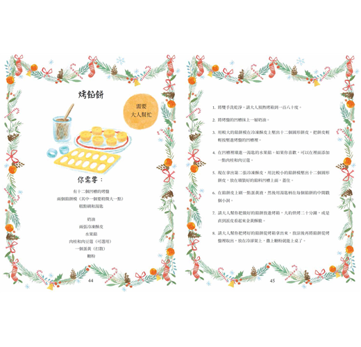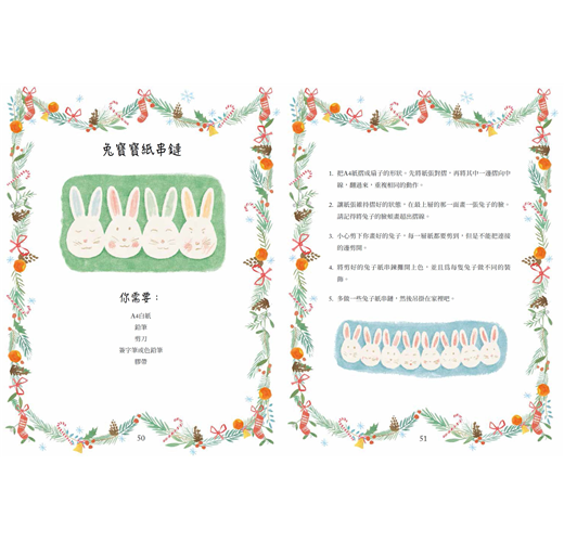 這種「一起歡度佳節」的同樂感,除了每天一則故事的陪伴外,讀者還能實際參與角色們在過節前所有的預備工作。這些出現在故事中的節期準備工作,被創作者巧妙的轉化和設計成有趣的延伸活動,讓小讀者可以利用身邊容易取得的素材,按著步驟,並且發揮自己的創造力,打造一個專屬於自己的聖誕節,體驗和實踐真正的聖誕精神。