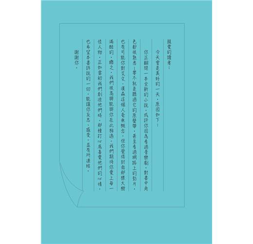你正翻開一本全新的小說。或許你因為看過音樂劇,對書中角色都很熟悉;要不就是聽過它的原聲帶,甚至看過網路上的影片,也有可能你對艾文‧漢森這個人毫無概念,但你覺得封面那棵大樹滿酷的,總之,我們很高興能與你在此相遇。我們期待你愛上每一位人物,正如當初我們創造他們時那種打心底喜愛他們的心情,也希望本書訴說的一切,能讓你反思、感受,並有所連結。