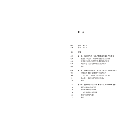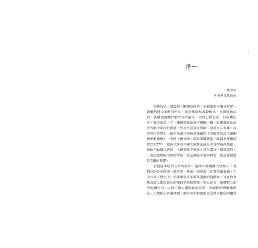 先睹為快。沒想到,剛讀完兩章,永毅便來信邀我寫序。我雖然對文革略有所知,但是哪能和永毅相比。在認得他以前,就讀過他關於劉少奇的論文,內容已經忘記,只依稀記得,實事求是,在一邊倒學術氣氛中獨樹一幟,對慘遭政治迫害的劉少奇反有批評,然而不是深文周納,而是言必有據。我研究中共歷史,後來知道中研院有他編的《中國當代政治運動歷史數據庫》,不時上網查閱,認為蒐羅豐富,縱跨毛澤東建政以來27年,很多文件在中國大陸都是秘而不宣的最高機密。他動手動腳找資料,上窮碧落下黃泉,甚至還為...